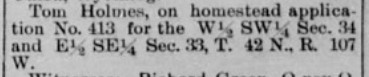 Thomas Holmes was born in Kansas in 1872. In 1899, he worked for Frank Welty on his ranch in the DuNoir, and Holmes was listed as a farmer in the 1900 Fremont County census. By 1903, Holmes was known as a Dubois ranchman. In 1905, he applied for a homestead located five miles west of Dubois on the Wind River in sections 33 and 34. The original homestead certificate for Mr. Holmes was signed by President Theodore Roosevelt in 1905. The cabin he built was later relocated to the Dubois Museum property. Also in 1905, Jim Stewart was awarded the contract by the U.S. Government to cut timber on Sheridan Creek.